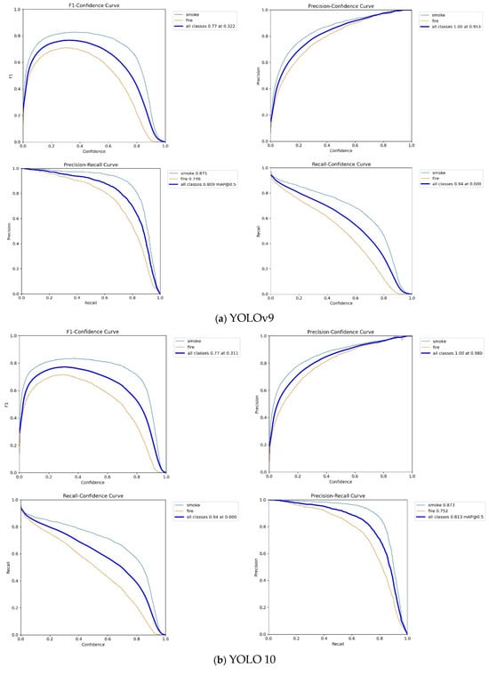 Figure 12 shows the performance evaluation curves for YOLOv9, YOLOv10, and YOLOv11, illustrating F1-Confidence, Precision-Confidence, Precision-Recall, and Recall-Confidence metrics for smoke and fire detection. These figures show the various aspects of the model performance over 100 epochs after the parameter changes. All the three models demonstrate high F1-scores and precision at optimal confidence thresholds. However, a trade-off between precision and recall is observed, particularly for the smoke class. While YOLOv10 shows promising results, YOLOv11 appears to offer slightly better performance, especially in terms of average F1-score and precision.