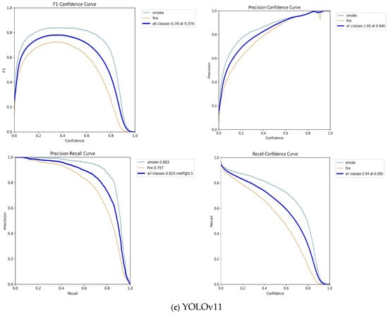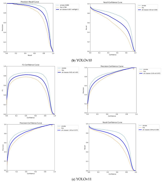 Performance evaluation curves for YOLO models, including F1-Confidence, Precision-Confidence, Precision-Recall, and Recall-Confidence metrics, for smoke and fire detection using YOLOv9 (a), YOLOv10 (b), and YOLOv11 (c) after parameter changes.