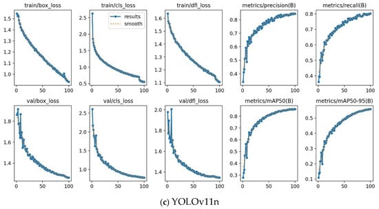 Figure 10 shows training and validation metrics on 100 epochs of YOLOv9 (a), YOLOv10 (b), and YOLOv11 (c) after parameter changes. In the graph, there is no significant difference between the training and validation patterns, indicating no clear signs of overfitting.