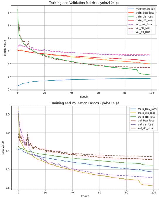 Figure 6 shows a comparative analysis between the 50 and 100 epochs of YOLOv9 (a), YOLOv10 (b), and YOLOv11 (c). The trends show that while there is a very slight change in the loss after 50 epochs, stability is maintained between the training and validation loss beyond this point. Up to 50 epochs, the difference suggests minor overfitting. Based on the results, we can conclude that although YOLO took slightly longer to train for 100 epochs, it achieved better test performance with minimal chance of overfitting. Overall, the results do not indicate any signs of underfitting.