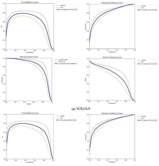 Performance evaluation curves for YOLO models, including F1-Confidence, Precision-Confidence, Precision-Recall, and Recall-Confidence metrics, for smoke and fire detection using YOLOv9 (a), YOLOv10 (b), and YOLOv11 (c).