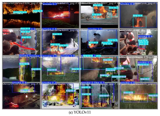 Figure 13 shows examples of fire detections of YOLOv9, YOLOv10, and YOLOv11 in various scenes, displaying the identification and labeling with confidence scores for each detected instance. Here, one can discuss the results frame by frame to analyze the performance of the models in detail.