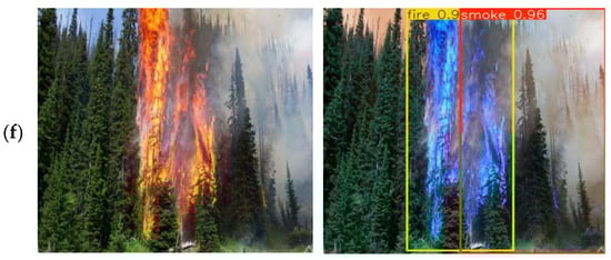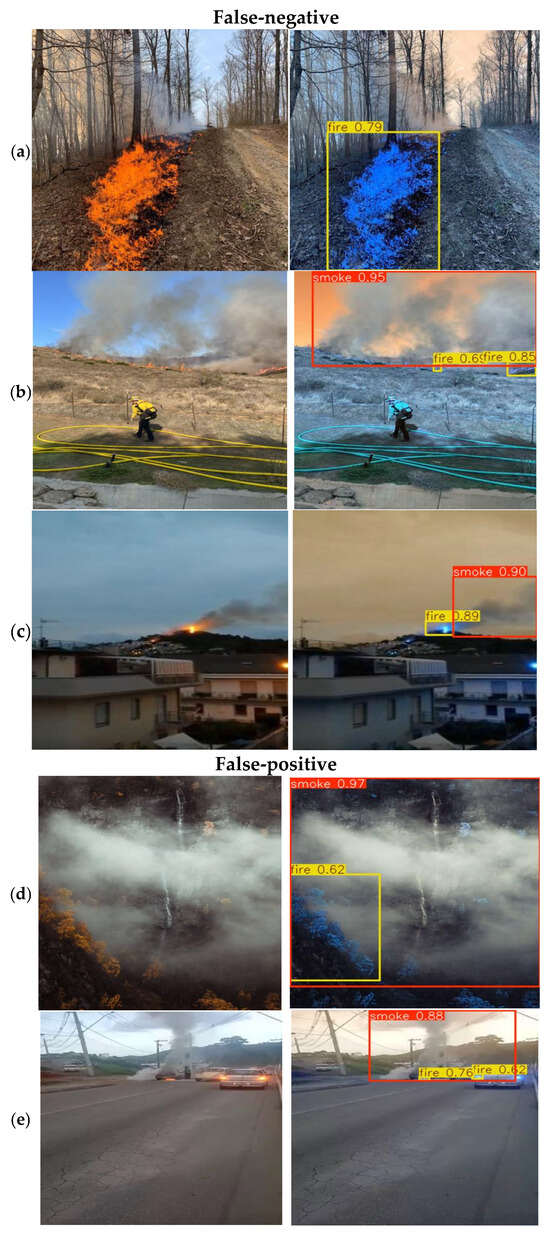 There are instances where YOLOv11 fails to detect or correctly classify objects, as shown in Figure 14, which highlights examples of false negatives and false positives. For false negatives: (a) the model fails to detect smoke in the area; (b) certain occurrences of fire are not labeled; and (c) another instance of fire goes undetected. For false positives: (d) a detection is incorrectly labeled as fire where no fire exists; (e) car headlights are mistakenly identified as fire; and (f) fire is erroneously classified as smoke.