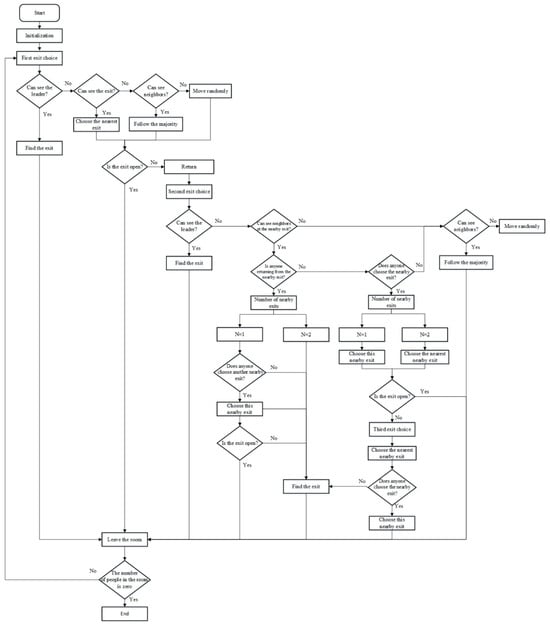 Specifically, when the number of neighboring exits someone returns from is two (N = 2), it indicates that the two neighboring exits are the wrong ones. In this case, the pedestrian can directly identify the opposite exit as the correct exit, and the direction of motion is toward the correct exit. When the number of neighboring exits from which someone returns is N = 1, this suggests that one of the two neighboring exits is incorrect. Under this circumstance, if the remaining exit happens to be the exit selected by other pedestrians, the pedestrian chooses that exit, or, vice versa, chooses the exit opposite to them. Three cases exist when the number of neighboring exits someone returns from is N = 0: if no exit is being selected, the opposite exit is determined to be the correct exit; if one exit is being selected, the pedestrian chooses that exit; if two exits are being selected, the pedestrian chooses the nearest neighboring exit, and a third exit choice is required if the selected exit is still wrong.