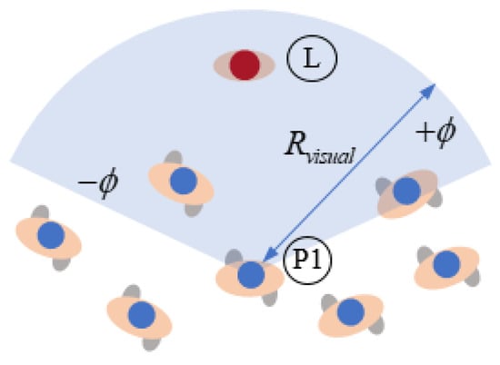 ③ If the pedestrians cannot see the leader or the exit within their field of view but they can see other pedestrians, they choose to follow the surrounding pedestrians. In other words, the pedestrians’ movement direction is the average direction of the pedestrians within their field of view, calculated by Equation (12).