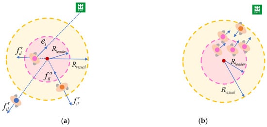 Figure 3a shows a diagram of the interaction force between the leader and the pedestrians at different distances, and the solid red circle is the position of the leader. The pedestrians are marked in blue outside the circular area with radius , indicating that these pedestrians cannot see the leader. The pedestrians are marked in orange when they are inside the circular area with radius and outside the circular area with radius , showing that the leader attracts these pedestrians to receive information. The pedestrians are marked in pink when they are inside the circular area with radius , showing that these pedestrians have received exit information and are moving directly to the correct exit. From then on, the pedestrians will no longer be attracted by the leader. In addition, if the pedestrian in the orange area who is approaching the leader encounters one who is leaving the pink area, the pedestrian turns away from the pink area (i.e., is no longer attracted to the leader), as shown in Figure 3b.