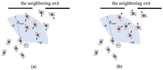 Determining the status of pedestrians at neighboring exits within the field of view. (a) Pedestrians are returning from the exit. (b) Pedestrians are choosing the exit.