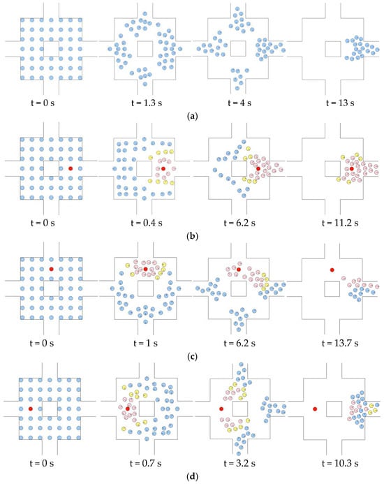 Evacuation dynamics of pedestrians under low stress levels. (a) No guidance, low stress level. (b) P-R, low stress level. (c) P-N-R, low stress level. (d) P-O-R, low stress level.