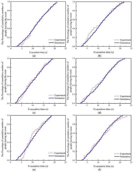 The simulation results need to be compared with the experimental results to validate the model. In this section, the model is validated in terms of three aspects: evacuation behavior, evacuation time, and the percentage of the cumulative number of evacuees over time.