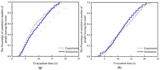 Comparison of experimental and simulated variation in the percentage of the cumulative number of evacuees with time. (a) No guidance, high stress level. (b) No guidance, low stress level. (c) P-R, high stress level. (d) P-R, low stress level. (e) P-N-R, high stress level. (f) P-N-R, low stress level. (g) P-O-R, high stress level. (h) P-O-R, low stress level.