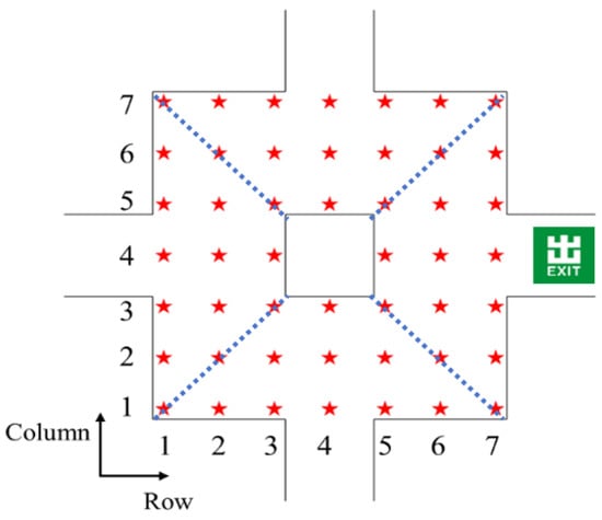 In the experiment of Zhang et al. [19], a leader was set up at each of the four potential exits. At a high stress level, the evacuation time for No guidance, P-R, P-N-R, and P-O-R was 21.5 s, 19.8 s, 18.7 s, and 18.5 s, respectively. It indicates that the farther the guided pedestrians are from the correct exit, the higher the evacuation efficiency at high stress levels. At a low stress level, the evacuation time for No guidance, P-R, P-N-R, and P-O-R was 21.8 s, 21.3 s, 23.3 s, and 20.6 s, respectively. This shows that there is no significant relationship between the leader’s location and the evacuation efficiency at low stress levels. In the model, several simulations were performed for these four leader positions under high stress levels, and the simulation results were compared with the experimental data for validation. The simulation results match the experimental results well. However, the four leader positions were all located near the exits. To further explore the impact of different leader positions on pedestrian evacuation, 48 possible locations for a single leader were planned based on the room structure and initial crowd distribution, as shown in Figure 7.