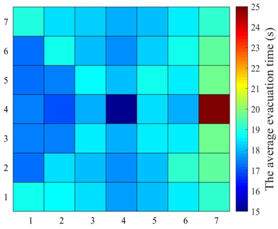 The simulation was repeated 20 times for a single leader in different positions, and the initial position of pedestrians remained the same in each repeated simulation. Only the right exit of the room was available. Based on the repeated simulations, the average value of evacuation time for each position was obtained, as shown in Figure 8. According to the location distribution of leaders, a 7 × 7 grid is obtained (the grid in the center is the obstacle). The color of each grid represents the average evacuation time under different guide positions, and the color’s shade represents the value of the evacuation time. The distribution of the leader positions can be divided into four regions based on the layout of the room, and the leader needs to provide the correct exit information to nearby pedestrians.