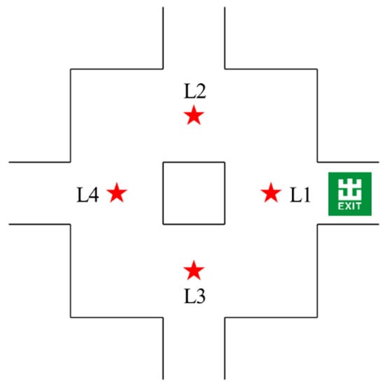 However, previous studies have focused on dynamic leaders who will lead pedestrians to the exit. Static leaders are characterized by providing pedestrians with exit information without moving with them. Exploring the relationship between different locations and numbers of static leaders and the evacuation performance of pedestrians is essential. In modeling studies, an emergency sign is an information point that can be considered a leader fixed in position and indicates the direction. Thus, issues related to emergency signs are instructive for the study of static leaders [10,13,14]. A significant difference between static leaders and emergency signs is the irreplaceable role of human beings. Specifically, well-trained leaders are “authorities” who have a positive social impact on pedestrian evacuation [15,16]. Moreover, leaders can provide route information based on the actual situation and help to calm pedestrians’ tension [17,18]. Zhang et al. [19] investigated the evacuation characteristics of pedestrians under the effect of leader behavior by conducting experiments on pedestrian evacuation under static guidance.