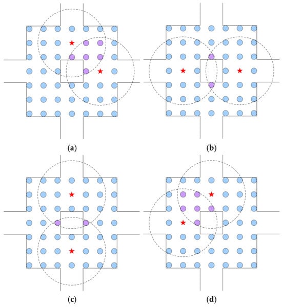 The numbers of pedestrians in the overlap area of the leaders’ influence range (the purple circles). The red stars, blue circles show the the leader position and the pedestrian position, respectively. (a) L1, L2. (b) L1, L4. (c) L2, L3. (d) L2, L4.