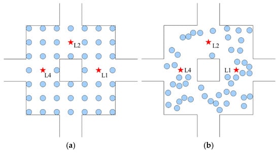 When the number of leaders is equal to 3, the evacuation time is shorter if the combination of leaders is further from the exit, i.e., Evac_(L2, L3, L4) < Evac_(L1, L2, L4) < Evac_(L1, L2, L3). However, the evacuation time of the two leaders at different combinations of locations does not conform to the law that evacuation efficiency becomes better when the leaders are further away from the exit, as shown in Table 4. That is, it does not conform to Evac_(L2, L4) < Evac_(L1, L4), Evac_(L2, L4) < Evac_(L2, L3), but to Evac_(L1, L4) < Evac_(L2, L4), Evac_(L2, L3) < Evac_(L2, L4). The reason is that there is an overlap between the influence range of multiple leaders, which affects the number of pedestrians who can obtain exit information from the leaders. Specifically, with the same number of leaders, the number of pedestrians in the overlap area increases, the leadership effect decreases, and the evacuation time increases. The “overlap area” means the area where the leaders’ influence scopes intersect. In Figure 10, there are more pedestrians in the overlap area of the leaders’ influence range when the leaders are located at L2 and L4 than when the leaders are located at L1 and L4, thus weakening the relationship between Dist and Evac. Similarly, more pedestrians are in the overlap area when the leader is located at L2 and L4 than when the leader is located at L2 and L3.