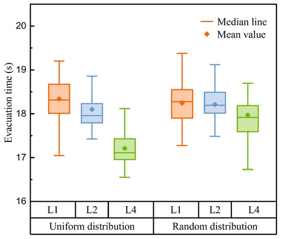 Figure 12 illustrates the evacuation time for different pedestrian distributions and leader locations. The results show that regardless of whether the pedestrians are uniformly or randomly distributed in the scenario, the evacuation time is shorter when the guided pedestrians are farther from the correct exit. In addition, the volatility of evacuation time under a random distribution of pedestrians is higher than that under a uniform distribution. The static leader aims to provide pedestrians with correct exit information to prevent pedestrians from wasting time by choosing the wrong exit. When pedestrians cannot receive information from the leader, they will select the exit nearest to them, which can potentially be incorrect. For pedestrians near the correct exit, the presence of a leader slightly impacts their finding the correct exit. Pedestrians in areas further away from the correct exit might choose the wrong exit, and the distance to the correct exit is also greater than in other areas. In this case, the presence of a leader significantly influences the choice of pedestrians at a distance, thus reducing the overall evacuation time.