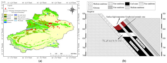Distribution of coalfield fires in Xinjiang region of China (a); structural profile shallow-buried goaf (b).