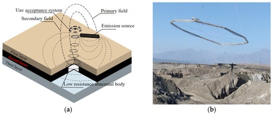 When a cavity forms in a certain part of the underground rock strata, it disrupts the integrity and continuity of the original strata, resulting in a substantial electrical conductivity difference between the cavity and surrounding rock [18]. The airborne transient electromagnetic method is based on the differences in conductivity and magnetic susceptibility of rocks (minerals). It follows the principle of electromagnetic induction, utilizing airborne coils to emit electromagnetic wave pulses. On the basis of the secondary induced electromagnetic field signals received by receiving coils, it examines the electrical conductivity differences in the strata both horizontally and vertically and describes the electrical conductivity characteristics of the geoelectric section, ultimately detecting the characteristics of underground structures [19,20]. The exploration principle is illustrated in Figure 3. The principle is consistent with that of the ground transient electromagnetic method, with only the data acquisition method and inversion calculations being adjusted accordingly.