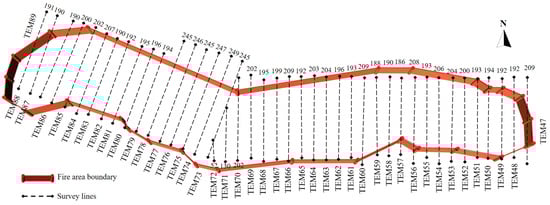 As shown in Figure 4, the geophysical exploration measurement lines in the No. 1 fire area were arranged nearly vertically along the trend of the coal seams (the trend of the goaf). According to the Specification for Fire Extinguishing in Coal Fields, the spacing between measurement lines was set at 30 m, with measurement points spaced 3 m apart. The numbers in Figure 4 represent the lengths of the measurement lines. Following pre-construction tests, the construction parameters used in this study were as follows: the height of the coils above the ground was controlled to be approximately 5 m; the diameter of the transmitting coil was 5 m; the diameter of the receiving coil was 0.5 m; and the flying speed was 8 m/s. A total of 43 transient electromagnetic measurement lines were arranged in the No. 1 fire area, numbered TEM47-TEM89.