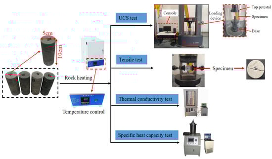For three typical rock samples—medium sandstone, fine sandstone, and siltstone—tests were conducted to measure their basic physical and mechanical parameters, including specific heat capacity, thermal conductivity, tensile strength, and elastic modulus at different temperatures. The experimental process is shown in Figure 5. In the UDEC calculation software (Version 7.0), the aforementioned material parameters were set as functions that varied with temperature.