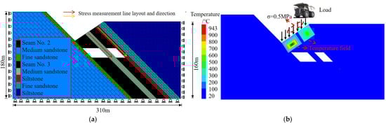 Table 1 presents the basic mechanical parameters of rocks at room temperature. The high temperature of 943 °C in the fire area will cause thermal expansion of the rocks, leading to thermal stress. More importantly, the physical properties of the rocks will change with variations in temperature [21,22]. Therefore, to more accurately reflect the actual conditions on site, the model not only simulates the effects of thermal stress caused by the temperature field but also considers the range of high-temperature effects on the raw coal and overburden, as well as the variations in their mechanical properties.