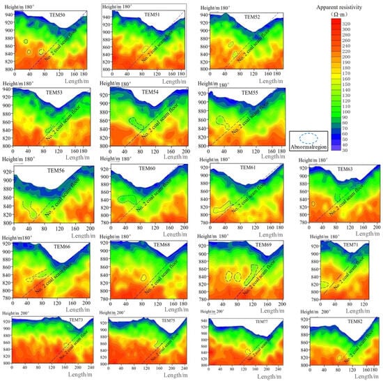 Through screening, filtering, and baseline correction of the raw data collected in No. 1 fire area in the Chatekale Fire Area (Xingliang II Mine Field), the exploration results were ultimately represented as contour maps of the apparent resistivity through various cross-sectional profiles, as shown in Figure 7. A total of 21 anomaly areas were detected. Our interpretation of the apparent resistivity contour maps was based on geophysical feature analysis, integrating the distribution of apparent resistivity contour anomalies, groundwater levels, minimum mining elevations, and the position of coal seam floors, among other factors, to provide a comprehensive interpretation. The area covered by the measurement lines was almost entirely comprised of goafs, and no anomalies were found in goafs outside the mining boundaries of +825 to +845 m. However, there were variations in the continuity of the overlying rock strata in the goafs, indicating differences in the degree of large-scale subsidence and fracture development. The exploration results for line TEM50 were verified through drilling, and the results were consistent, confirming the accuracy of the exploration results obtained using the airborne transient electromagnetic method.