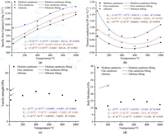 The specific heat capacity was tested using a high-temperature calorimeter for solid materials, while the thermal conductivity was measured using a thermal conductivity meter. During the experiment, the samples were heated to predetermined temperatures (room temperature, 200, 400, 600, 800, and 1000 °C) using a muffle furnace, and the specific heat capacity and thermal conductivity of the rock samples were measured. The variations in specific heat capacity and thermal conductivity with changing temperature, as well as the fitting results for each rock type, are shown in Figure 8a,b. From these graphs, it can be observed that as the temperature increased, the thermal conductivity of medium sandstone, fine sandstone, and siltstone generally showed a trend of initially decreasing and then increasing, while the specific heat capacity exhibited an overall increasing trend. This mechanical behavior of sandstone at high temperatures has also been reported in previous studies.