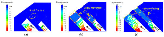 Rock strata movement in a fire area. (a) Without the effect of the temperature field; (b) With the effect of the temperature field; (c) With the effect of stress and temperature field.
