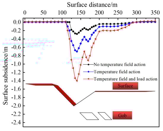 The numerical simulation results were processed and analyzed, with Figure 9 illustrating the movement of rock strata in the fire area and surface subsidence under the three different simulation scenarios. From Figure 9, it can be seen that after coal mining, the stress in the coal body above the goaf was redistributed. When the tensile or shear stress on the coal body exceeded its ultimate strength, local failure occurred, causing blocks to fall into the goaf. In the absence of an applied temperature field, the coal body above the goaf remained structurally stable under the compression of the roof and floor rock strata, and the coal body did not slide into the goaf. Instead, blocks below the coal body fell into the goaf owing to their self-weight stress. After applying the temperature field, under the coupled effects of thermal stress and mining-induced stress, substantial displacement areas appeared in the coal body above the goaf, causing the overburden structure to tilt further into the goaf. Additional blocks of coal dropped, and some of these falling blocks formed overlaps owing to the compressive forces and friction between the rock strata, preventing further sliding of the coal body into the goaf. After applying the load, the amount of sliding of the coal body into the goaf further increased, with blocks at the interface between the coal body and rock layers dropping into the goaf. The compressive forces on the coal body from the roof and floor rock strata gradually decreased. Under the influence of these two adverse factors, friction between the rock strata decreased. When the frictional force is less than the external force, the overburden structure becomes unstable, leading to severe mining accidents.