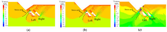 The distribution of vertical stress under the three different simulated working conditions is shown in Figure 11. It can be observed that the maximum stress distribution pattern in the goaf was essentially the same across all three simulations. Influenced by coal strata mining, the goaf generated a secondary stress field in the upper and lower coal bodies as well as in the roof and floor rock strata. Substantial stress concentration occurred within a large range at the corners of the roof and floor of the goaf, with the stress concentration forming a stress arch above the coal body in the left-hand section of the goaf. This is a result of the steeply dipping, super-thick coal seam being located above, while the roof and floor are positioned on both sides. After coal is extracted, the vertical constraints are markedly reduced, and the mining process also causes the roof and floor rock strata to bend, break, and shift toward the goaf. This results in clamping on the coal body, ultimately leading to stress concentration.