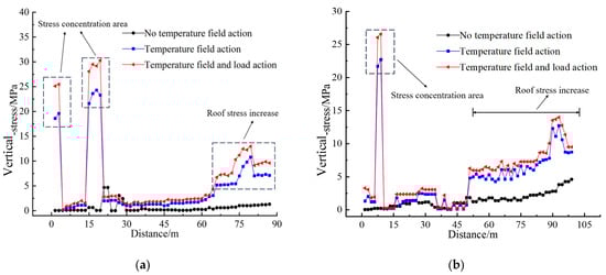 The distribution of vertical stress in the roof of the goaf under the three different simulated working conditions is shown in Figure 12. It can be observed that the vertical stress variation patterns on both sides of the goaf roof were quite similar, with the stress variation curve exhibiting a concave shape, being higher on the sides and lower in the middle. Without the application of the temperature field, the maximum vertical principal stress on the left-hand side of the goaf roof was 4.7 MPa. Under the influence of the temperature field, the roof stress increased to 24.3 MPa, representing an increase of 417%. With the combined effects of the temperature field and load, the stress rose to 30.3 MPa, representing an increase of 544.7%. On the right-hand side of the goaf roof, without the temperature field applied, the maximum vertical principal stress was 4.6 MPa. Under the effect of the temperature field, the roof stress rose to 22.7 MPa, representing an increase of 393.5%. With both the temperature field and load applied, the stress reached 26.6 MPa, representing an increase of 478.3%.