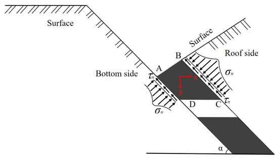 Under normal circumstances, after coal mining, the stress in the surrounding rock changes owing to mining-induced effects, leading to alterations in the stress state of the overburden above the goaf. An imbalance in the stress on the coal body above a near-surface goaf is sufficient to create goaf instability. To explore the static load stress distribution characteristics of coal bodies above goafs in inclined coal seams, a mechanical model was established, as shown in Figure 13. Under triaxial stress conditions, steeply dipping coal seams primarily experience normal stress (σn) and shear stress (τn) at the contact surface owing to the forces from the roof and floor. The normal stress at the contact surface mainly arises from the clamping force exerted by the roof and floor on the coal body. Assuming the length of the goaf is one unit, the calculation formula for the stress relationship on the coal body (A, B, C, D in Figure 13) above the goaf is as follows: