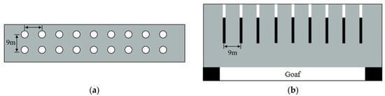 - Conducting management of the goaf based on its exploration results by arranging boreholes for blasting. Vibration management should be applied to shallow goafs to ensure the complete collapse of the goaf tunnels in one go, eliminating safety hazards for machinery and ensuring the safety of stripping operations. Figure 14 shows the layout of the goaf management plan, with boreholes arranged vertically to the ground and spaced 9 m apart to mitigate the adverse effects of blasting on tunnel stability. The explosive used is a mining-grade water gel explosive, with a detonation velocity of 3600 m/s and a power factor of 239 mL. The blasting hole depth is 30 m, the blasting hole diameter is 75 mm, the Charging diameter is 63 mm, the Charging length is 13 mm and the sealing length is 17 m.
