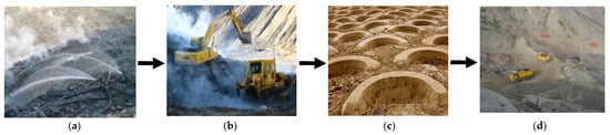 Considerable quantities of coal resources in Xinjiang are found at relatively shallow depths (average depth of <200 m). During the extraction of shallow coal seams, mining-induced fractures can easily penetrate the entire overburden, connecting the goaf with surface fire areas and enabling a rapid spread of fires into deeper coal seams. Meanwhile, the interaction between thermal stress caused by high temperatures and mining-induced stresses in the fire areas can damage the surrounding rock, as shown in Figure 1b. When this damage reaches a certain level, it results in a decrease in the strength of the overburden roof (coal body) [15]. When managing coal fires near a goaf, accidents caused by roof instability can easily occur. Therefore, researching management techniques for surface coal fires above shallow-buried goaf in steeply dipping coal seams in this region is vitally important to ensure safety in coal fire management and the green and sustainable development of the coal industry in China.