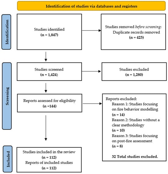 Figure 1 presents the PRISMA flowchart detailing the systematic research process from identification through final inclusion analysis (see Supplementary Material S1—PRISMA Checklist). The initial search across five major academic databases (Web of Science Core Collection, Scopus, ScienceDirect, Google Scholar, and regional databases) yielded 1847 potentially relevant studies. Of 1424 non-duplicate papers, 112 (7.9%) met all inclusion criteria. This selection rate reflects the study’s focus on methodologically rigorous assessments with clear indicator specifications and validation approaches. Through the screening, 144 eligible studies was selected and proceeded for further analysis (see Appendix A Table A1). Excluded studies primarily lacked methodological detail (n = 892), focused on post-fire assessment rather than risk prediction (n = 234), or were purely theoretical without empirical application (n = 186).