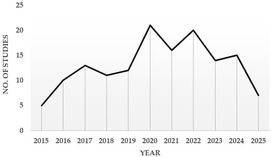Temporal distribution chart of studies analyzed from 2015–2025 (2025 year studies only in the first quarter of the year).