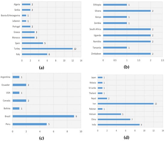 Regional distribution by country representative of forest fire risk assessment: (a) Mediterranean basin, (b) Africa, (c) America, and (d) Asia.