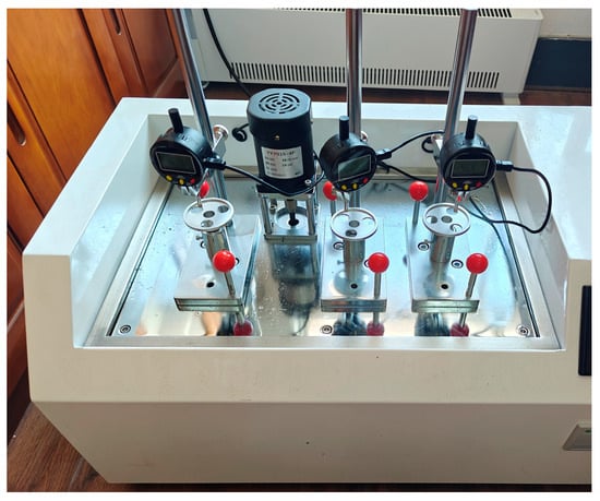 The thermal deformation test is a standardized method for evaluating the thermal resistance of polymer materials by determining the heat deflection temperature (HDT). In this experiment, a constant load (calculated using Equation (1)) was applied to the specimen under controlled conditions to induce an initial deformation. The loaded specimen was then placed in a thermal chamber and heated at a uniform rate. As the temperature increased, the mechanical strength of the material declined, resulting in progressive deformation. The experimental setup was illustrated in Figure 3.