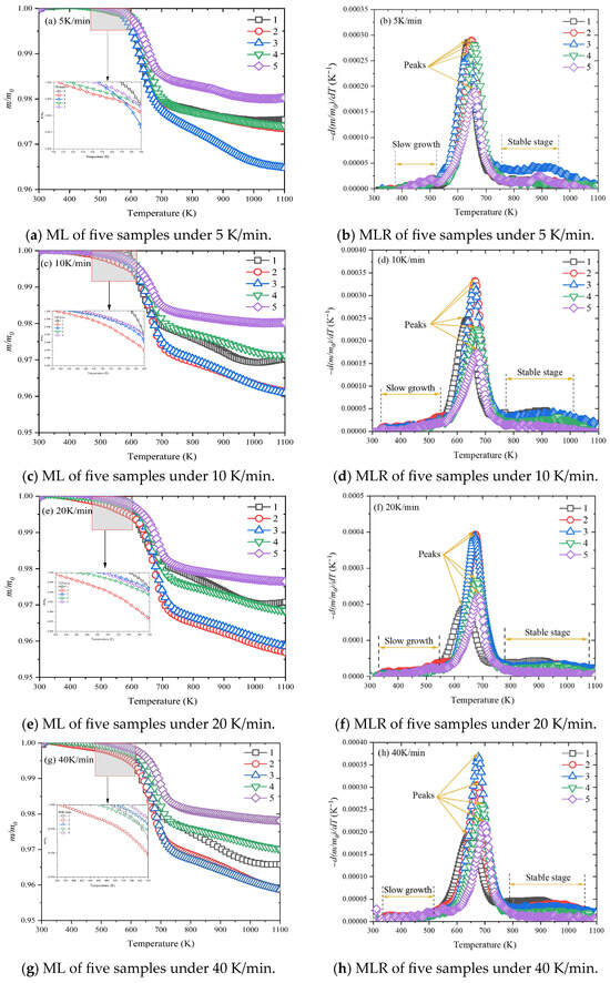 where dα/dT stands for reaction rate. β denotes the heating rate, while f(α) represents the reaction mechanism function. The key kinetic parameters include the pre-exponential factor (A) and activation energy (Eα). T indicates the absolute temperature, and R is the universal gas constant. The conversion rate (α), defined by Equation (4), is calculated from the mass evolution, where m0, m∞, and mt correspond to the initial, final, and instantaneous sample masses, respectively.