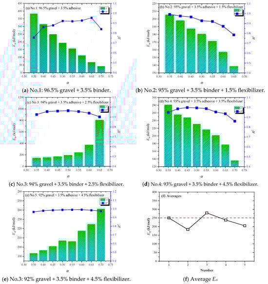 The Eα represents the minimum energy barrier that must be overcome for the combustion process to occur, serving as a critical indicator of combustion difficulty []. Higher values of Eα correspond to increased difficulty in ignition and sustained burning. The calculated Eα values are depicted in Figure 6.