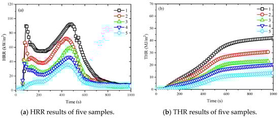The Heat release rate (HRR) is a critical parameter for assessing combustion behavior, as it provides direct insight into real-scale fire kinetics []. Among these, the peak HRR (PHRR) is especially significant due to its major impact on flame spread characteristics, making it a key focus in fire safety research []. As shown in Figure 7, experimental results indicate that the incorporation of a flexibilizer effectively reduces the overall heat release rate of the composite material. As flexibilizer content increases, the first exothermic peak becomes progressively less pronounced, and the entire HRR values gradually decrease. It clearly indicates that the flexibilizer contributes to heat release suppression during combustion. Similarly, the total heat release (THR) shows a consistent decreasing trend.
