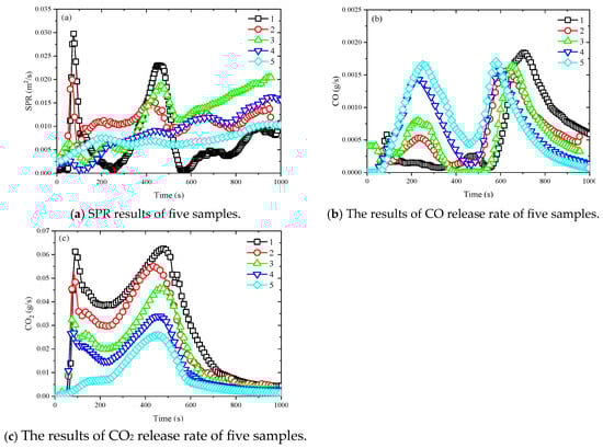 In terms of combustion, the heat released by materials is highly destructive. Thermal hazards arise primarily from the energy released during burning, which can cause structural damage, spread fire, and endanger surroundings. The PHRR and THR are critical parameters that quantify heat release per unit time and over the entire process, respectively. Higher values of PHRR and THR indicate that the material releases heat more intensely and in greater quantity, thereby increasing fire severity. In addition to thermal effects, combustion also generates smoke and toxic gases, such as SPR, CO, and CO2. A higher smoke release rate leads to more severe fire hazards.