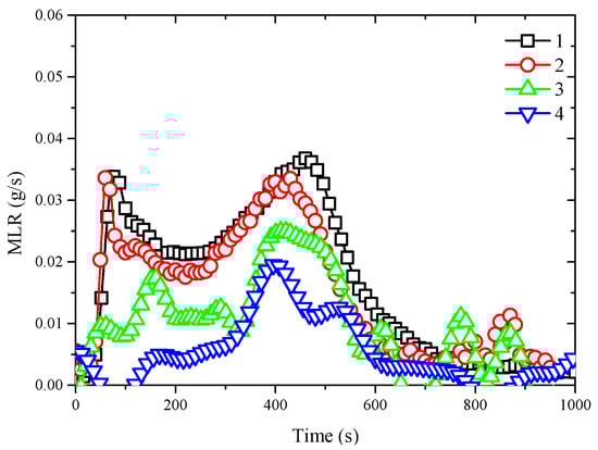 Figure 9 illustrates the mass loss rate of the soundproof enclosures. Experimental results reveal an inverse relationship between the content of the flexibilizer and the mass loss rate of samples. With increasing concentrations of the flexibilizer, the material exhibits a progressively slower mass loss during combustion. At lower additive levels (below 3.5%), the mass loss rate curve exhibits a distinct bimodal pattern, suggesting two distinct decomposition stages. However, when the concentration of flexibilizer reaches 3.5%, this bimodal behavior transitions into a single, significantly reduced peak, indicating that pyrolysis is more controlled. This modification in mass loss rate profile suggests that the flexibilizer effectively alters the thermal degradation mechanism of the material.