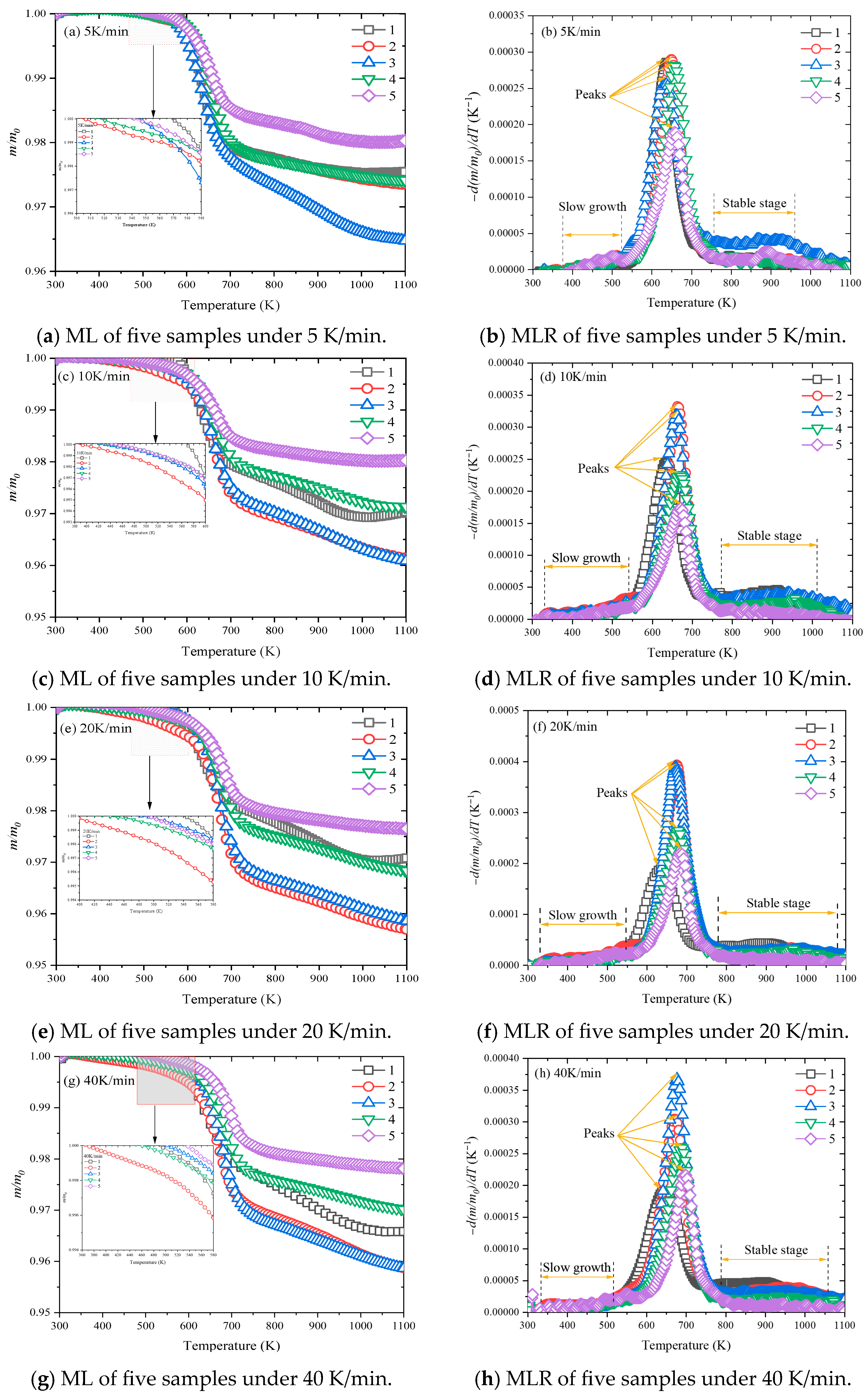 - Tang, X.; Xie, Q.; Qiu, R.; Yang, Y. Development of a relationship between kinetic triplets and heating rates to improve pyrolysis kinetic modeling of polymer. Polym. Degrad. Stab. 2018, 154, 10–26. [Google Scholar] [CrossRef]