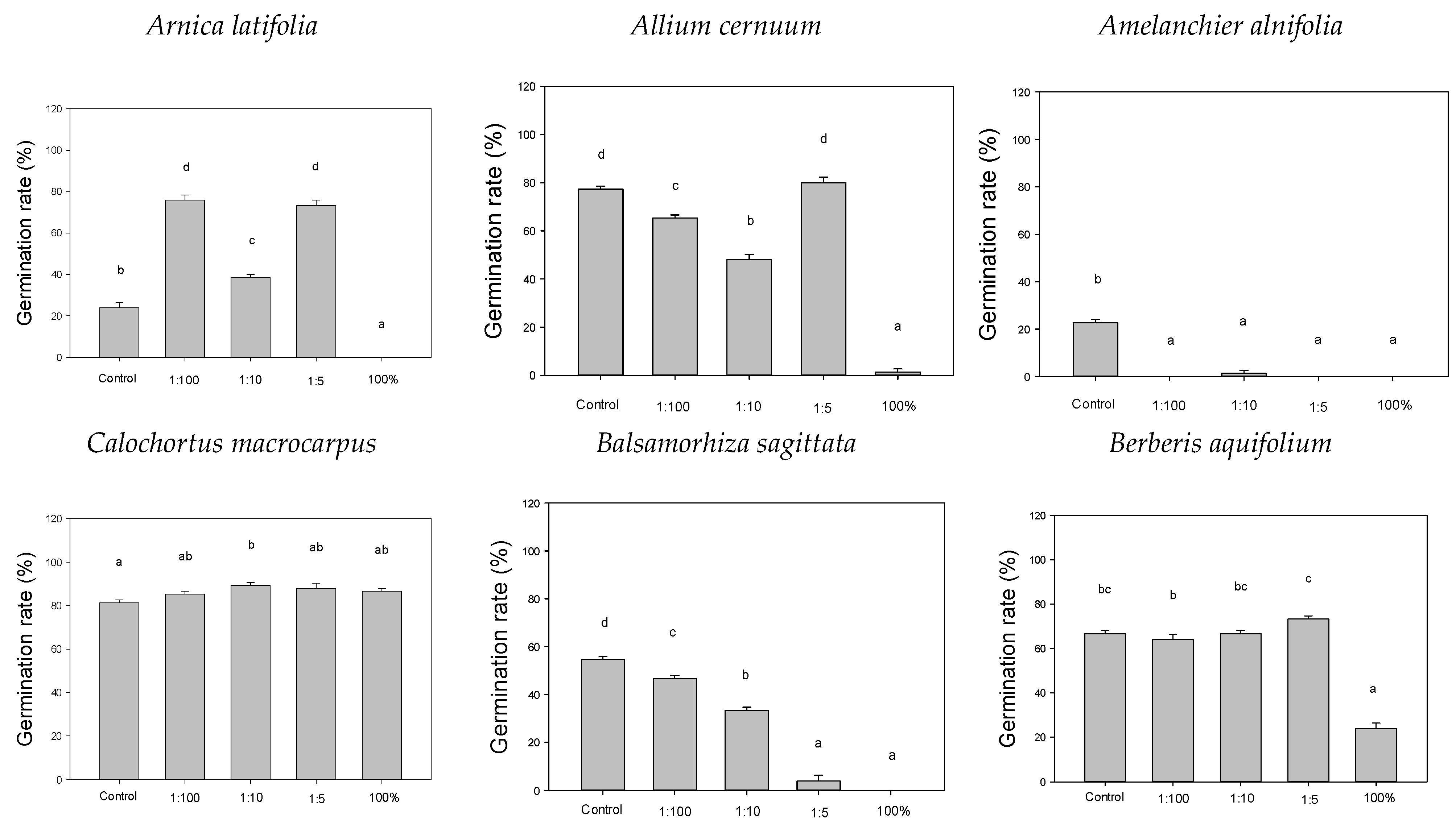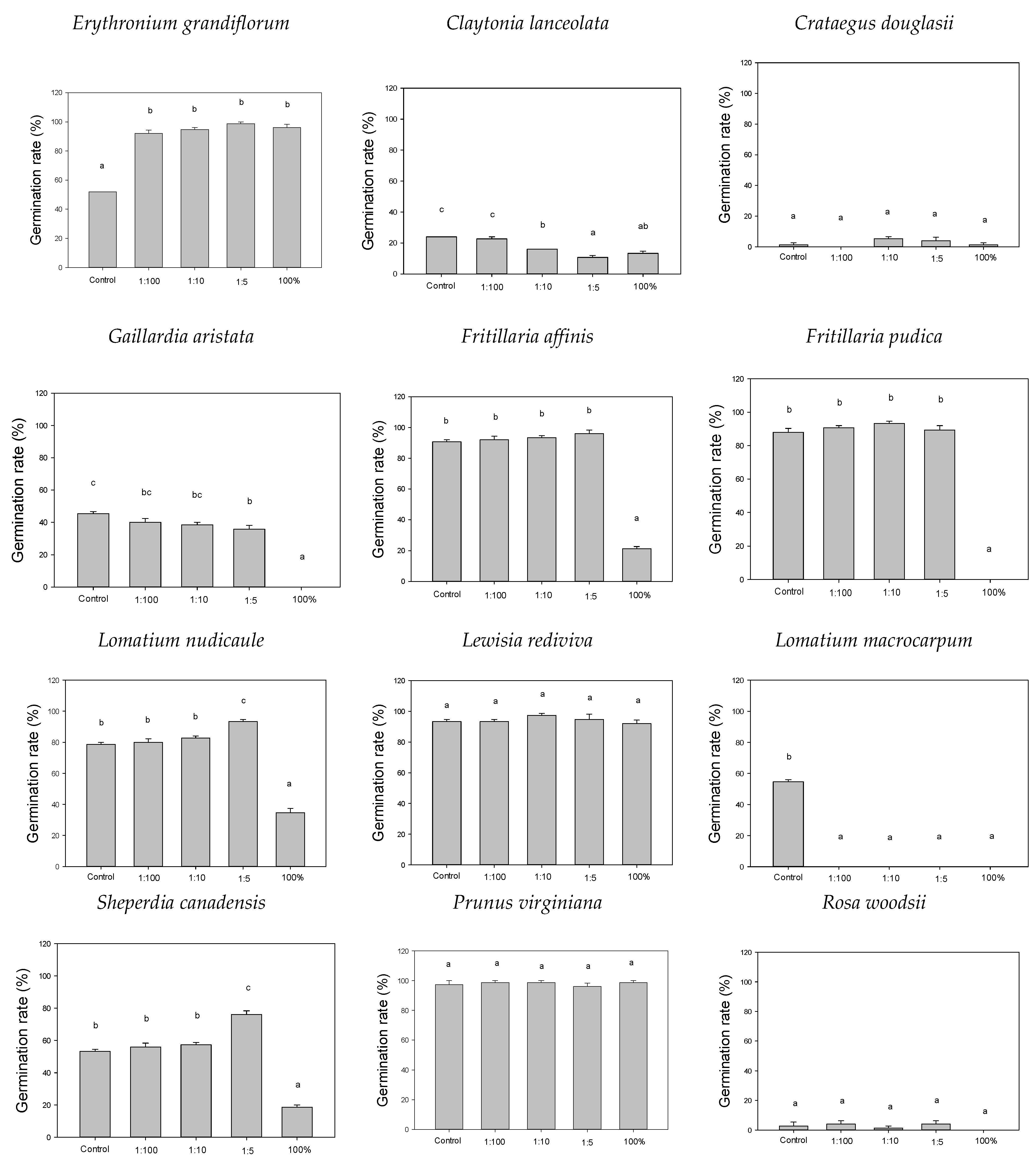 - Ren, L.; Bai, Y. Smoke originating from different plants has various effects on germination and seedling growth of species in Fescue Prairie. Botany 2016, 94, 1141–1150. [Google Scholar] [CrossRef]