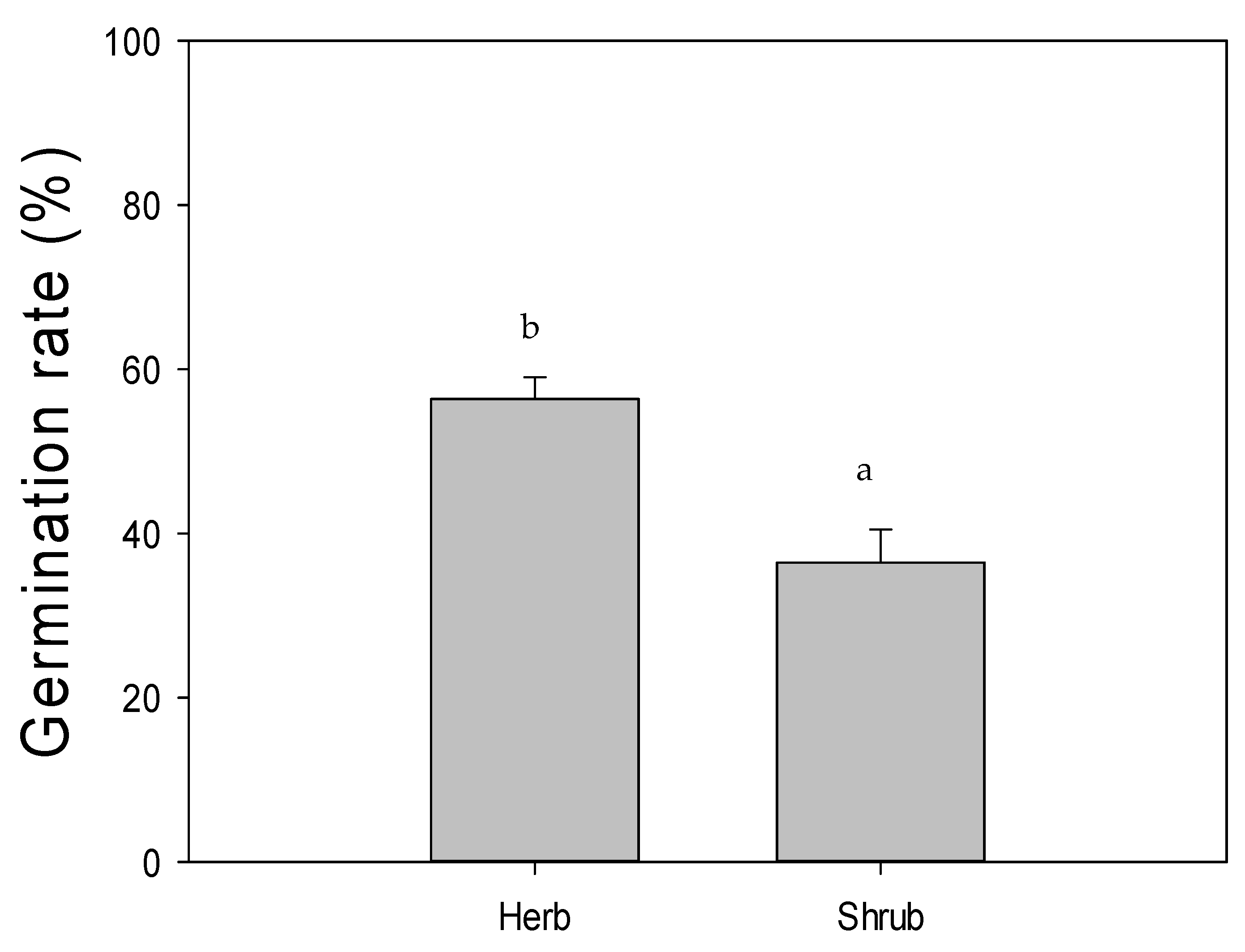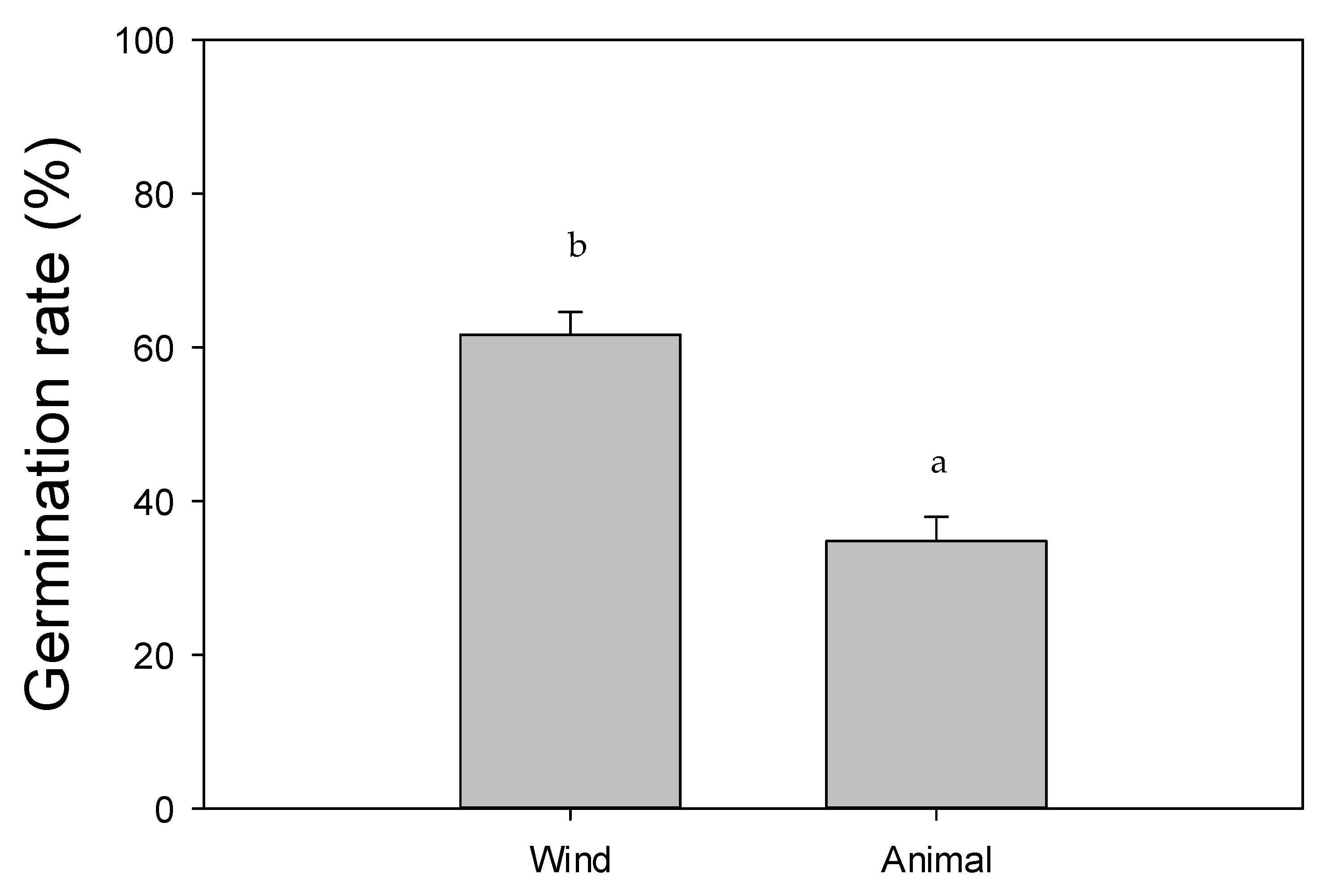 - Meyer, G.A.; Witmer, M.C. Influence of seed processing by frugivorous birds on germination success of three North American shrubs. Am. Midl. Nat. 1998, 140, 129–139. [Google Scholar] [CrossRef]
