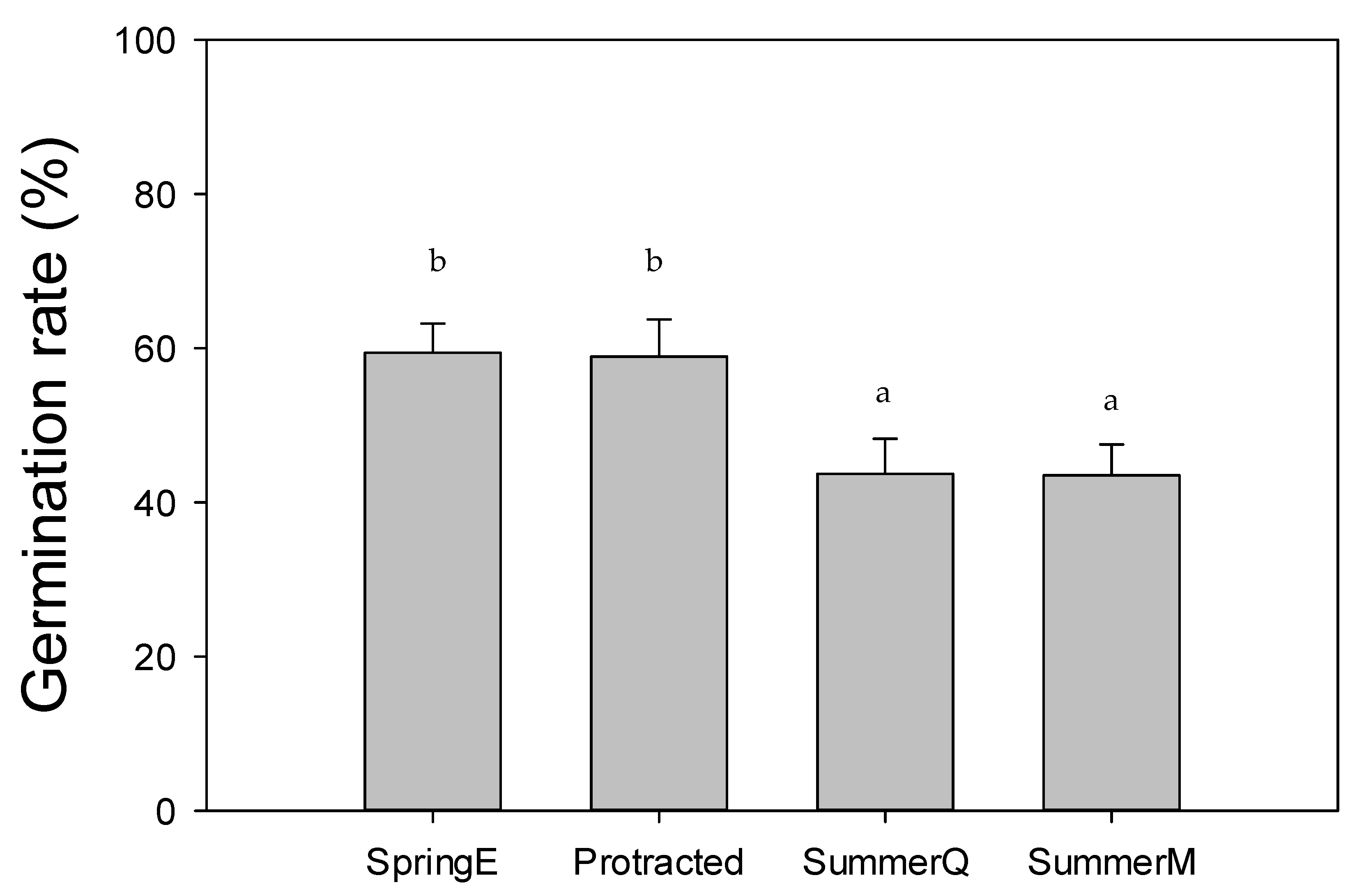 - Park, H.K.; Ko, C.; Lee, S.; Kim, S.; Yang, J.; Lee, K. Ecophysiology of seed dormancy and germination in four Lonicera (Caprifoliaceae) species native to Korea. J. Ecol. Environ. 2019, 43, 25. [Google Scholar] [CrossRef]