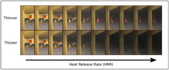 A challenge in experimentally manipulating smoke and growth characteristics is the strong association with HRR. For example, with all other aspects the same, a slower growing building fire will have accumulated more smoke in a room than a faster growing fire when measured at the same HRR. In addition, the soot production of a fire affects combustion []. The approach of the present study was to focus on the perceptual characteristics of a hypothetical fire while controlling the parameters of the fire across the experimental conditions. To do so, the thickness of smoke was manipulated using the opacity settings of the rendered fire within PyroSim rather than by changing the soot production parameters of the simulation. Although this approach artificially adjusted the visual characteristics of the fire, by doing so, the FDS results underlying the simulation were consistent across conditions with the transparency of the smoke being manipulated. Participants were randomly assigned to either thinner (5% opacity, more transparent) or thicker smoke (10% opacity, more opaque; between-subjects). These levels of opacity have been observed in prior research to influence judgments of fire risk and protective actions during hypothetical scenarios [,].