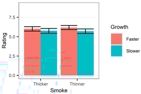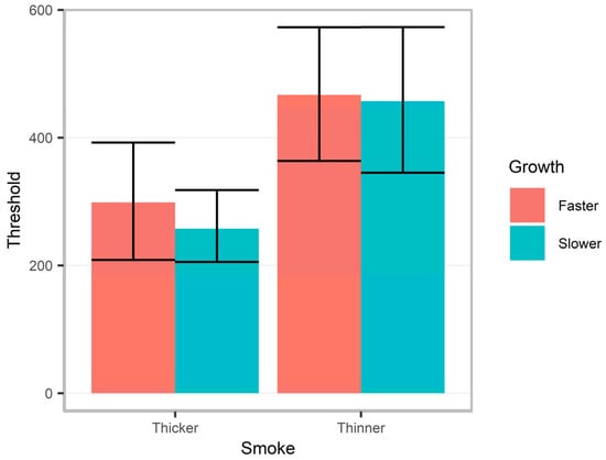 Extinguisher threshold was next compared across smoke thickness and growth rate conditions (scaled and centered). Due to evidence of heterogeneity across conditions, a robust linear model was run using the ‘MASS’ (version 7.3-60.2) ‘sandwich’ (version 3.1-1), and ‘lmtest’ (version 0.9-40) R-packages [,,]. A significant main effect of smoke thickness was observed, z = −2.80, p = 0.005; no significant effects of growth rate nor interaction were observed (ps > 0.8) This indicated that participants in the thinner smoke condition were more likely to attempt to use the extinguisher with more intense fires than those in the thicker smoke condition (Figure 4; see Supplementary Material for exploratory demographic analyses).