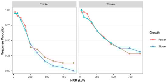 An initial analysis investigated whether participant responses varied with fire HRR (Figure 3). Evidence of sparsity in responses was observed across participants. Specifically, few 0’s (“no” responses) were observed with lower HRR. To provide a more robust analysis with more stable convergence behavior, the ‘glmmTMB’ package (version 1.1.12) [] was used to run a logistic regression with a random intercept for participant and slope for HRR. A significant main effect of HRR was observed, z = −12.39, p < 0.001; participants were less likely to use the extinguisher as HRR increased.